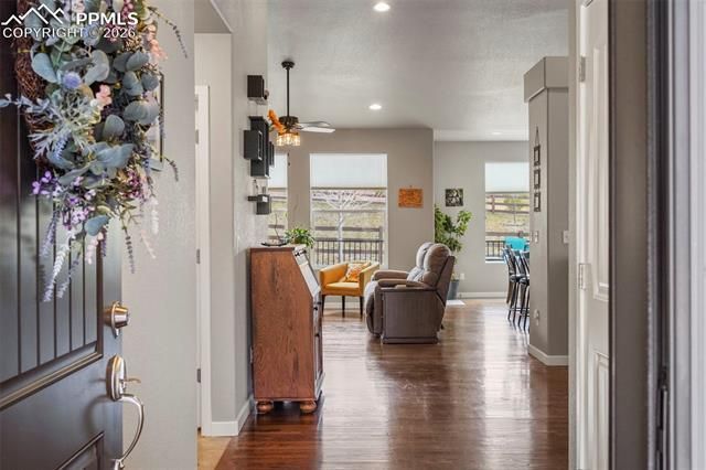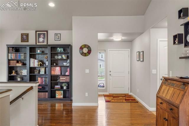 Indulgence meets function in this beautiful home filled with special touches. Site-finished hardwood flooring flows through the main level living areas. Kitchen with upgraded maple cabinetry featuring soft-close doors, pullout drawers and crown molding. Plus, “Colorado contemporary”-styled stacked slate backsplash, newer stainless steel appliances (2023-2025), large pantry and expanded cabinetry for all the storage you desire. Kitchen is also pre-plumbed with gas for future range upgrade. 2nd Dining Area on main level is flexible space (currently used as a library). You will love the outdoor living possibilities with an expanded composite deck, relaxing hot tub, garden boxes and backing to open space and trail system. And if entertaining is your jam, check out the stunning custom wet bar with top-of-the-line leathered granite countertop and live-edge decorative shelving, plus a theater area with screen, projector and speakers included. Huge storage room features built-in wood shelving and is pre-plumbed as a future Junior Master Suite. The insulated garage boasts a 4-foot extension, making it over 24-ft deep for your larger vehicles or extra storage for bikes and toys. Located in the desirable North Fork at Briargate neighborhood with easy access to Powers Blvd, I-25 and nearby shopping & entertainment districts, plus just blocks from Pine Creek High School & STEM-focused Encompass Heights Elementary. Additional features include a newer roof (2024), upgraded cellular blinds throughout, Larson storm doors with pull-down screens at front and back doors, A/C and humidifier, quartz countertops in kitchen and all baths, upgraded shower tile with luxury waterfall glass accent, LED lights for energy-efficiency throughout, and Cat-5 network cabling in living room, theater room and all bedrooms. Plus, a peek-a-boo view of Pikes Peak from the front bedroom…perfect to watch the fireworks on New Year’s Eve. Your own bit of warm sunshine and all you could want for your new home!